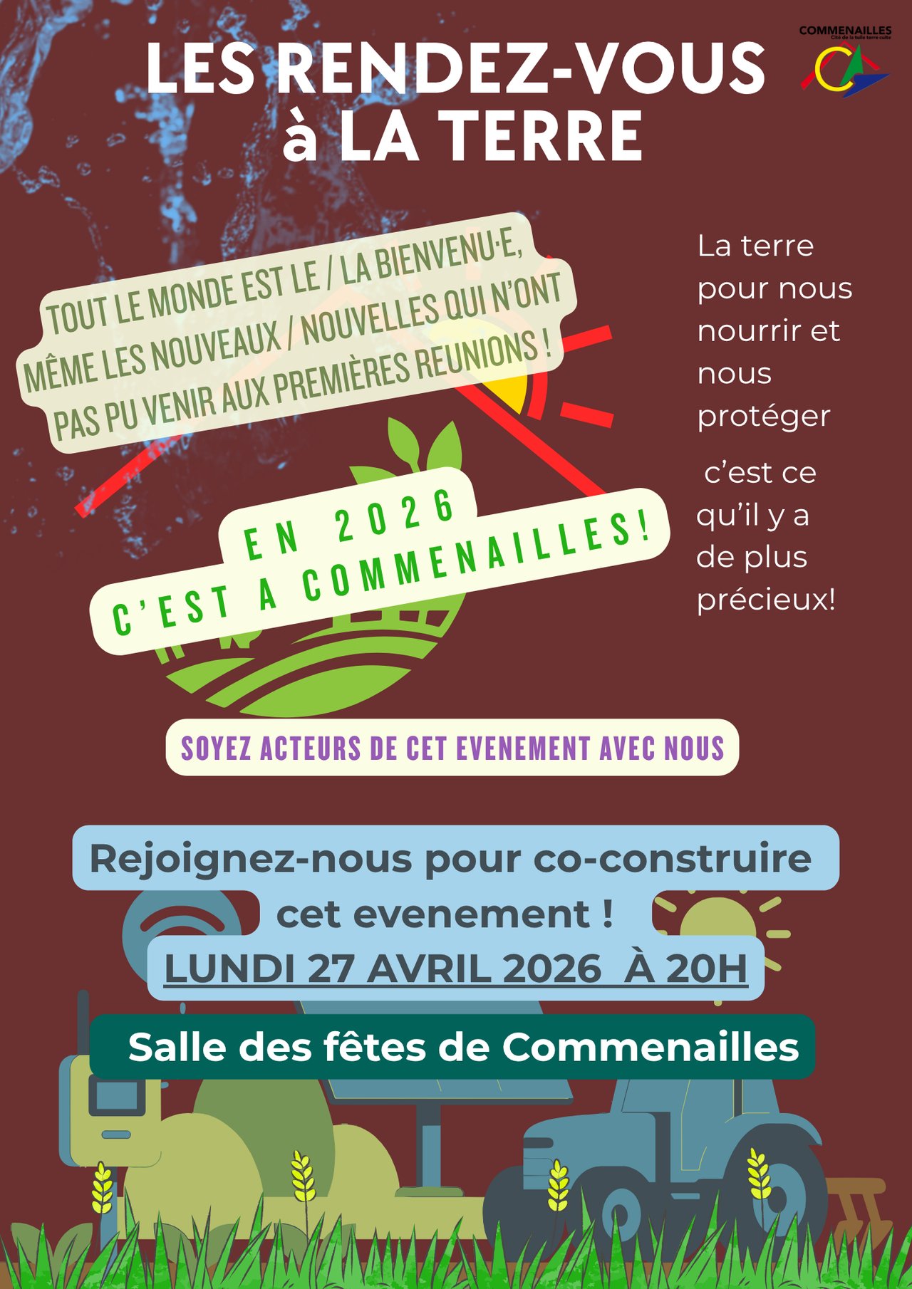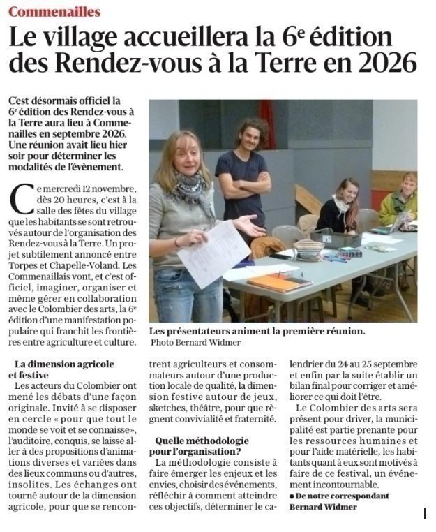 Que vous ayez participé(e) ou non aux précédentes réunions, vous êtes invité ce lundi 27 avril à 20H à la salle des fêtes pour la 6ème réunion de co-construction des RDV à la terre qui se dérouleront dans notre village en 2026.